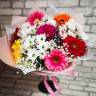 Как на самом деле выглядит райский осторв? Флористы изобразили этот оазис в виде букета из девяти разноцветных гербер, разбавив яркую палитру тремя белоснежными веточками кустовой хризантемы. Милые цветы приятно смотрятся и радуют глаз обилием ярких красок, живым теплом и красотой декоративного оформления.